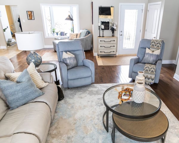 To help accent the space, Magaly also added two Finley Recliners in a grey colour with blue undertones. She felt that, since hosting was important to her, her guests (or her boys) could enjoy their own reclining comfort separate from the sectional.