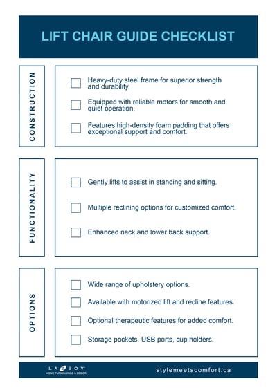 The right size ensures that your head rests comfortably against the cushion, your feet touch the floor at a 90-degree angle, and the chair lifts you smoothly without strain. To get a better idea of what our Top-Selling La-Z-Boy Power Lift Chairs are, read this article.